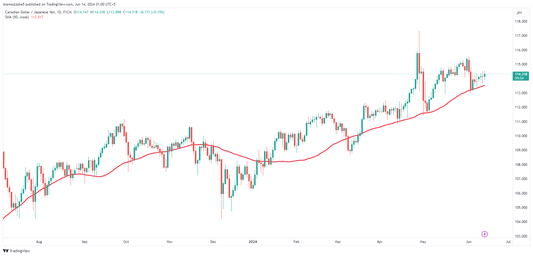 Image 6. A moving average with a value of 50 is plotted on the daily chart of USDJPY. Notice how the market bounces off the MA. Some traders use confirmation from several technical indicators before placing a trader. For eg as the market makes a new high and approaches the 50 periods MA, the RSI may be over 80, indicating overbought conditions. A bearish engulfing candlestick pattern further confirms the short bias on this position.