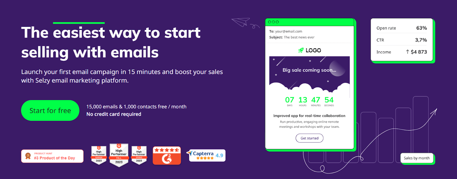 Selzy is a great email marketing tool for small and medium-sized businesses. It offers all you need to start growing your sales with emails, from a user-friendly email builder to extensive analytics. The platform also has a number of interesting features like anti-spam check and an email verifier.