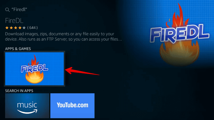 Step 4: Now return to the Home Page. Click on the Search icon and enter “FireDL’ using the Firestick remote.