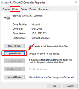 There is a need to update your driver if there is a storachi.sys property listed in the SATA ACHI controller driver’s properties.