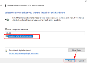Step 8) Select Standard SATA AHCI Controller, then select Next. Finish the rest of the procedure as instructed.