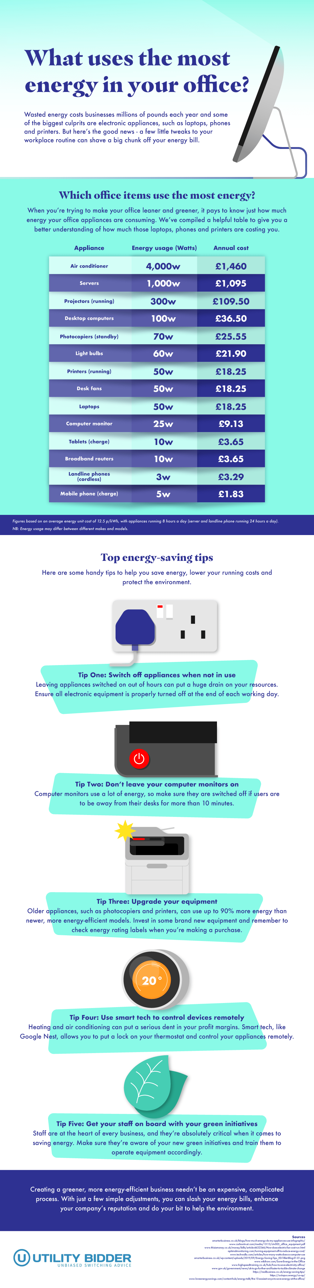 To make it easier to turn your office tech off when you’re not using it, consider connecting multiple devices to a power strip that’s located within easy reach. This will mean it only takes a second to switch your appliances off at the plug when you’re not using them, removing the temptation to leave them on standby – which drains power unnecessarily.