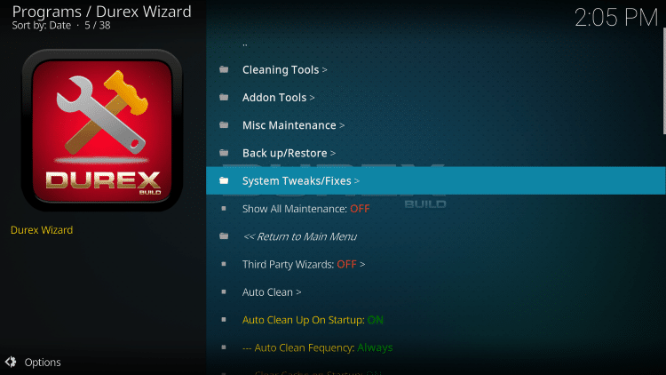 Step 2- Choose the Durex add-on that you previously installed. Then click on Maintenance, followed by System Tweaks/ Fixes.