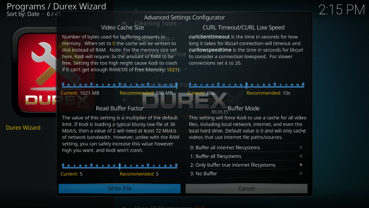 You will reach an interface that will look like the screenshot below. In the new window crank up the cache size and values for buffering by clicking on the Write File option. After making the changes, restart your Kodi and start streaming again.