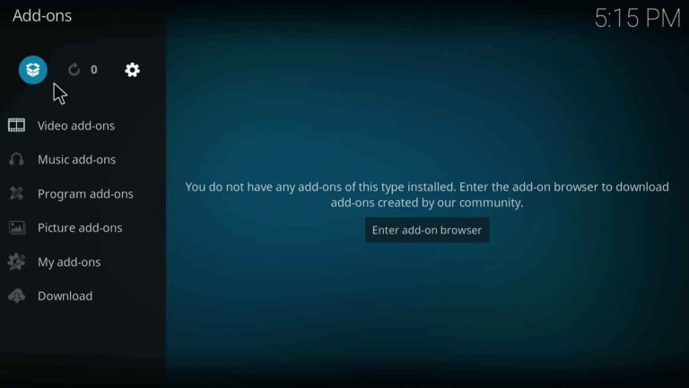 Step 5- Revert to Kodi Main Menu by pressing ESC key multiple times. Here click onAdd-ons and finally click the Box Shaped icon.