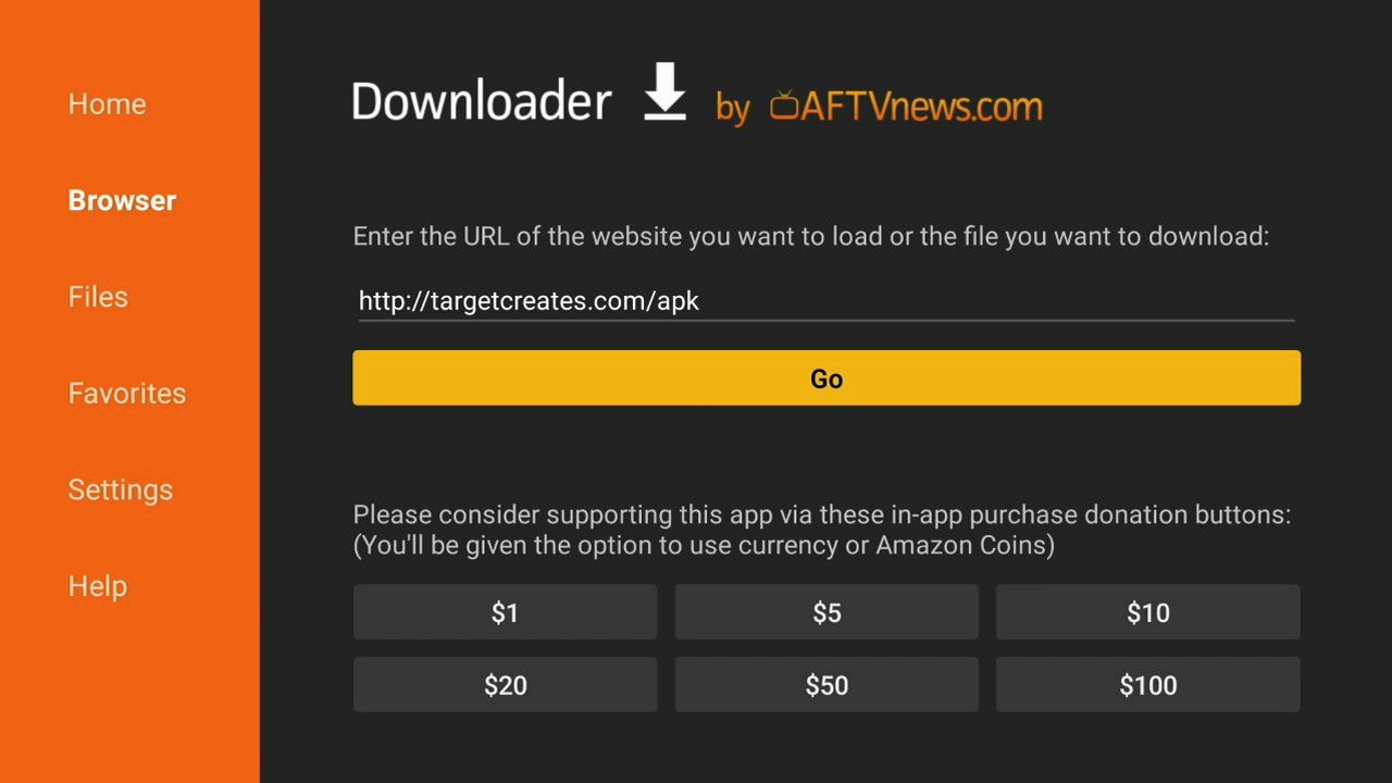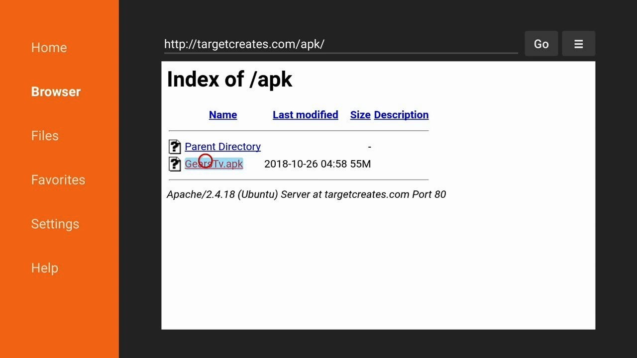 Step 4- After entering the Downloader app, give the Gears TV URL- http://targetcreates.com/apk. You will be redirected to a new screen. Click on the GearsTv_Master-release-arm.apk option.