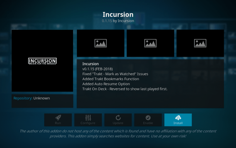 Incursion does not host its own media content but fetches it from other multiple streams like third-party add-ons. So follow the steps to get Incursion Kodi installed on your device.