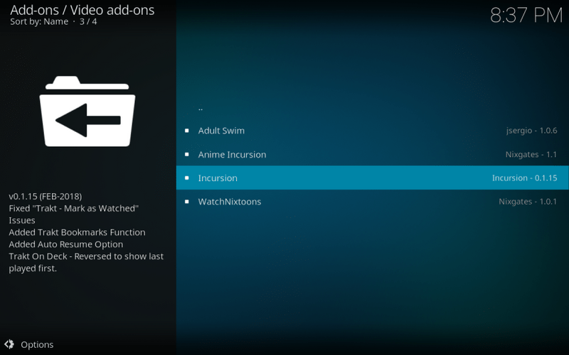Wait for a few seconds and the notification as “Incursion Add-on installed” will appear on the top right of your screen. Now you can head to Kodi homepage > Add-ons > Video Add-ons > Incursion. And begin to explore the addon.