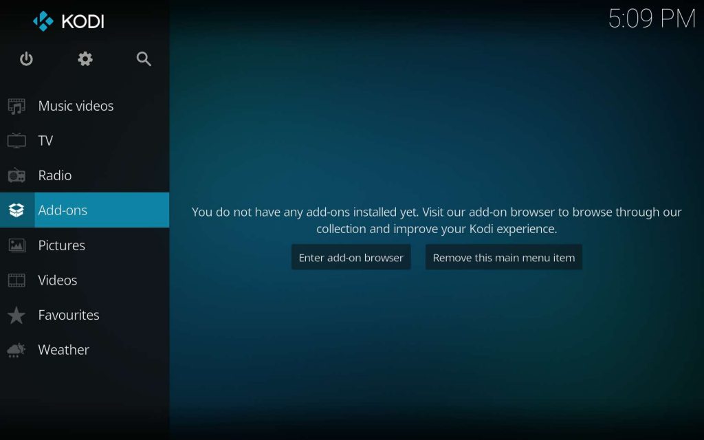 Step 6– Head back to the Kodi Home Screen. Click on the Add-ons menu item.