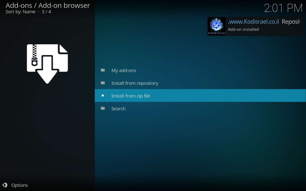 Step 10– Wait for a few moments, and you will notice a popup in the top right which will indicate .www.Kodisrael.co.il Repository Add-on Installed.