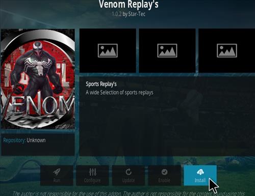 Step 15- The pop up of the installation screen of Venom Replays will appear. Select Install to Install Venom Replays on Kodi.