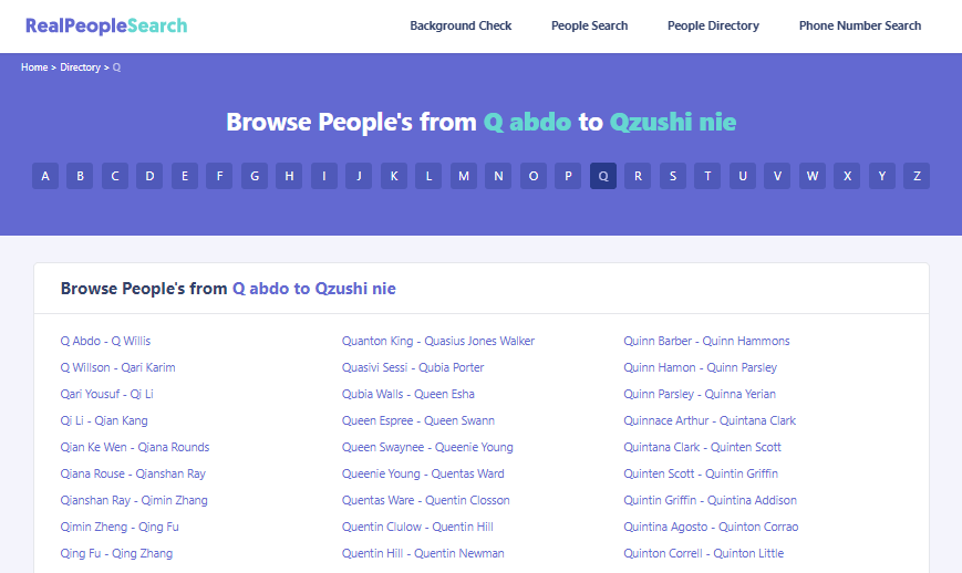 There are a number of different people search engines available online. Here you can do a people search with first name starting with Q. Simply enter the person’s name and other information into the search engine and see what comes up. You may be able to find contact information, social media profiles, and other information about the person.