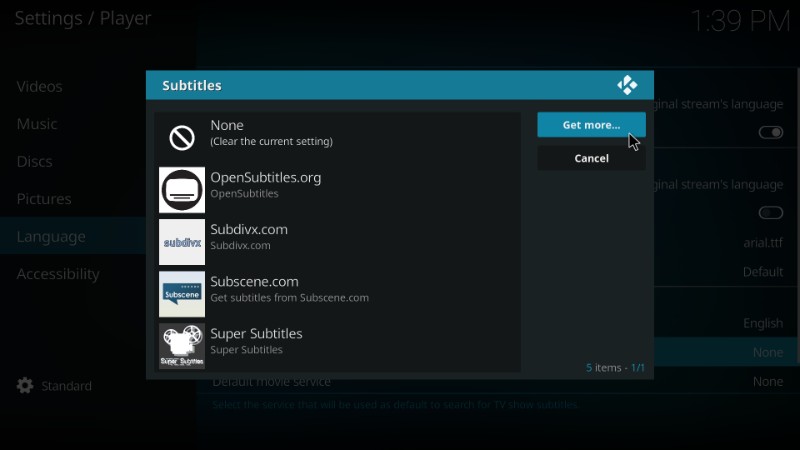 Step 5- Click ‘Get more…’ button and download the Subscene.com subtitle service for Kodi. Once you have installed Subscene.com, it will also appear on your list.