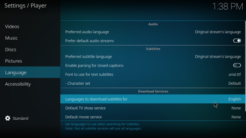 Step 3- Select the ‘Language’ option on the left panel and under ‘Download Services’ on the right click ‘Languages to download subtitles for’ to change/select the desired language Kodi subtitles. English is the default language and you can change it.