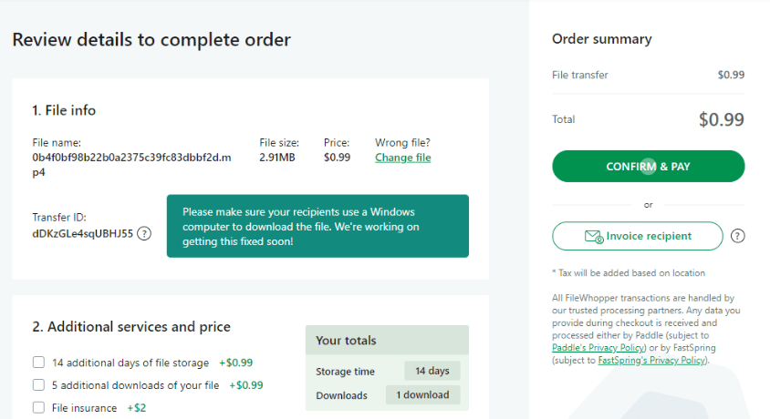 - On your left, you will see the exact quote for sending your file. Click “CONFIRM & PAY” to proceed.