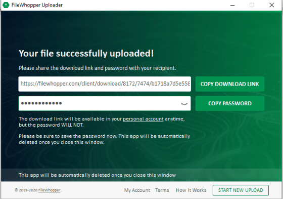 - Your recipient can start the download process as soon as you begin uploading your file. Now copy your transfer details by clicking “COPY DOWNLOAD LINK” and “COPY PASSWORD.” Remember, the app will disappear as soon as you close the upload window. Therefore, make sure to save the password because you won’t find it in your account. However, you can find the link after logging in to your FileWhopper account.