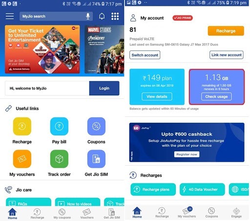 There is no sort of USSD code to know the data balance. So, in this case, you can utilize the My Jio app. Apart from this, you can also go for the app to know 4G data vouchers, Jio tunes, recharge offers, various plans, SMS, balance & much more. Follow the below-mentioned steps to check the data balance.