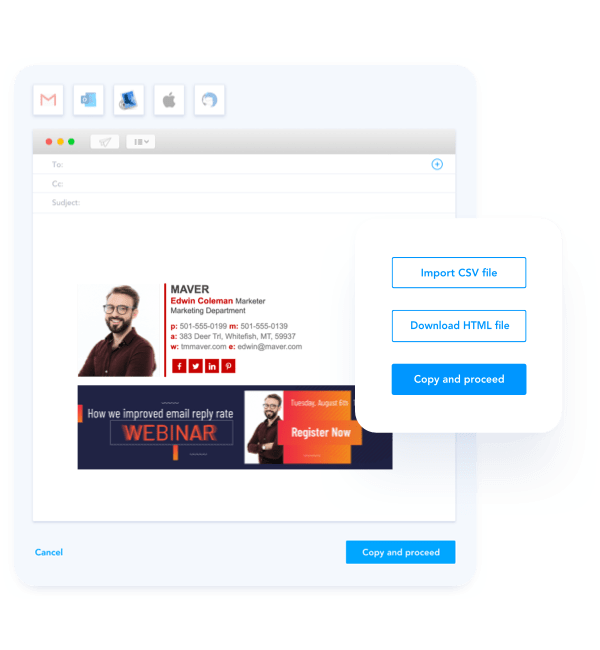 Professional signatures with detailed information are essential for webinar invitation email. Since this is the last element people see in emails, you need to make the signature creative and memorable. Email signature generators can also help make it more personalized. Using all the benefits email signature has to offer (banners, calls to action, links, a photo of a sender, etc.), you can encourage more people to join the webinar. See more email signature examples to design the best signature to promote your webinar. It’s free!