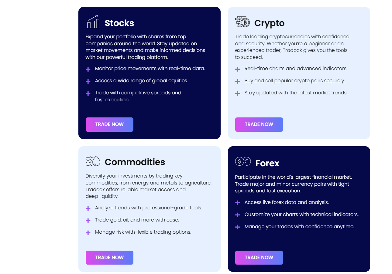 Tradock offers access to a diverse range of asset classes through CFDs (Contracts for Difference):