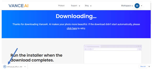 Step 2: After the extension has been downloaded, download the VanceAI PC setup by clicking the extension file in the lower left corner of your browser, as shown in the image below.