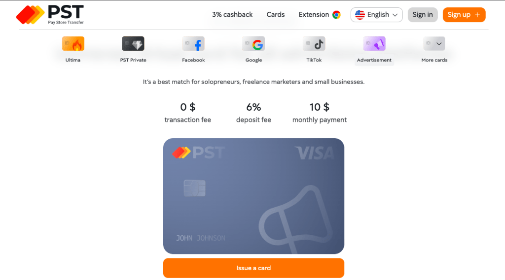 - Exclusive cashback program: Earn 3% cashback on advertising expenses, issue up to 100 cards per month for free, and enjoy reduced top-up fees (as low as 3%). This PST Private program is ideal for those managing large budgets and looking to minimize costs.